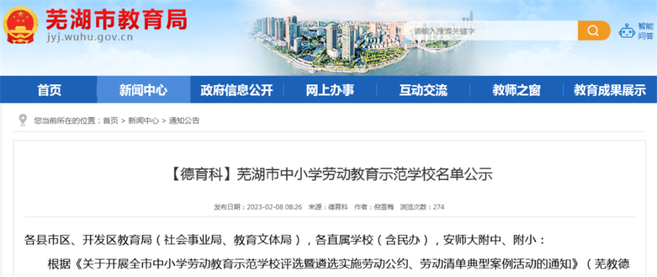 根据《关于开展全市中小学劳动教育示范学校评选暨遴选实施劳动公约、劳动清单典型案例活动的通知》(芜教德〔2022〕28号)文件精神,各县市区教育局、市直学校共推荐24所学校参加市中小学劳动教育示范学校评选。经市教育局组织专家组对24所推荐学校材料进行评审,评出市中小学劳动教育示范学校14所,现予以公示,公示时间2023年2月8日—2月14日,公示期间如有异议,请于2023年2月14日下午5点前向市教育局德育科反映。